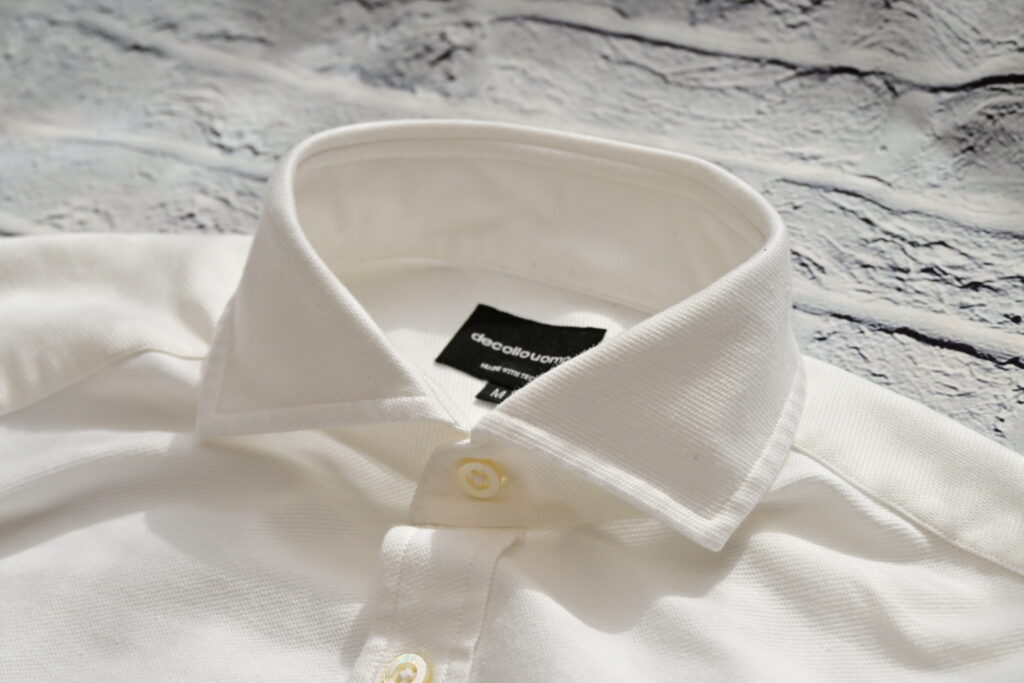 1.襟元(Collar): 第一印象を決定づけるパーツ。乾燥機の熱と回転を経ても、ノータイで自立するハリが維持されているか。