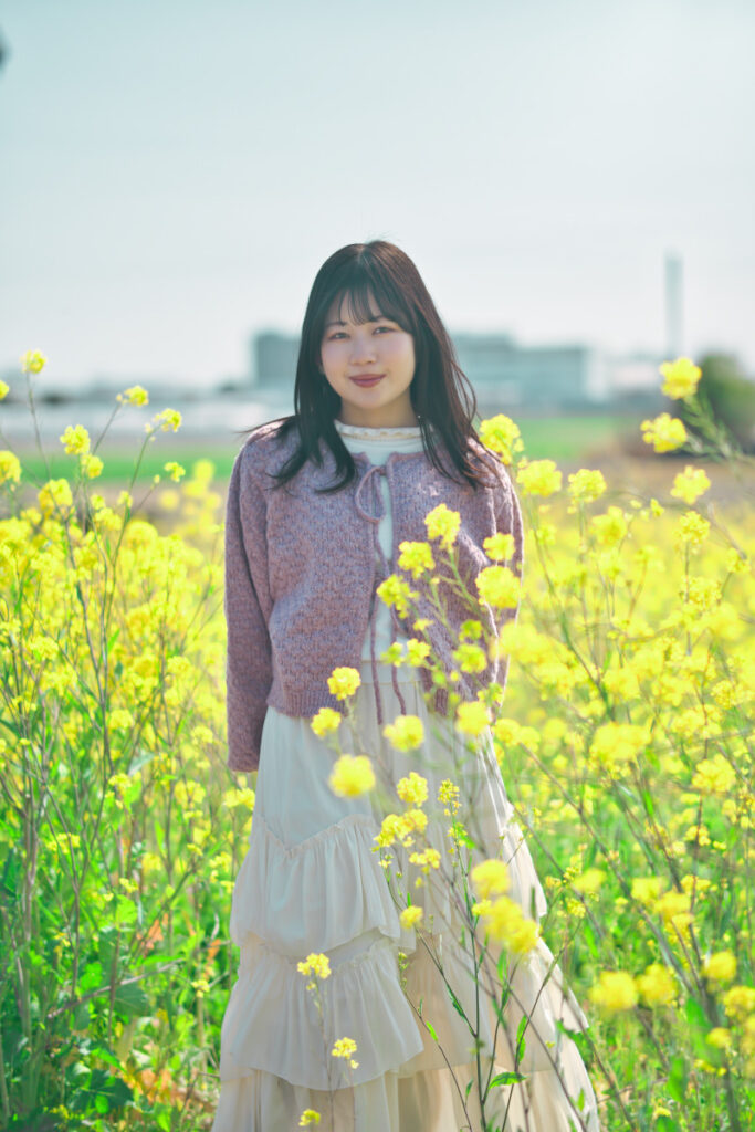 85mmでは近すぎて顔のクローズアップになってしまう距離感でも、35mmなら「モデルを菜の花が包み込むような、包容力のある構図」が完成します。ここで重要なのは、モデルに「座ってもらう」こと。高さを抑えることで、広角特有のパース(遠近感)が強調され、菜の花に包まれた物語へと変わるのです。