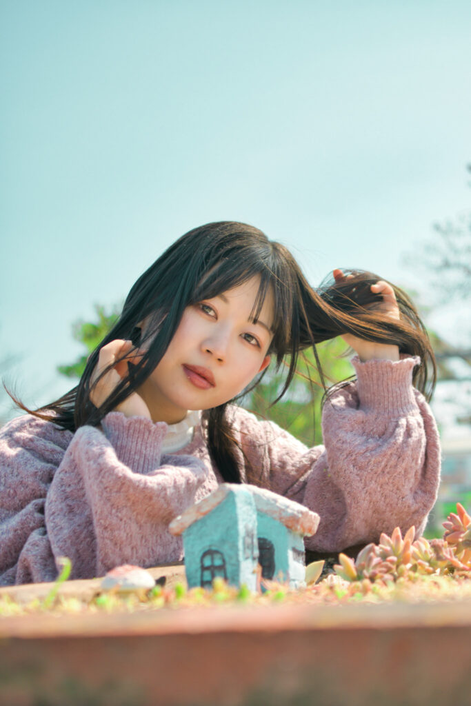 多肉植物のグリーンと、メルヘンな小さな家に囲まれ、ぬぬさんの表情が際立つ人物重視の「縦のポートレート構図」です。余計な背景情報が整理され、視線が自然とモデルへ向かうこの一枚。